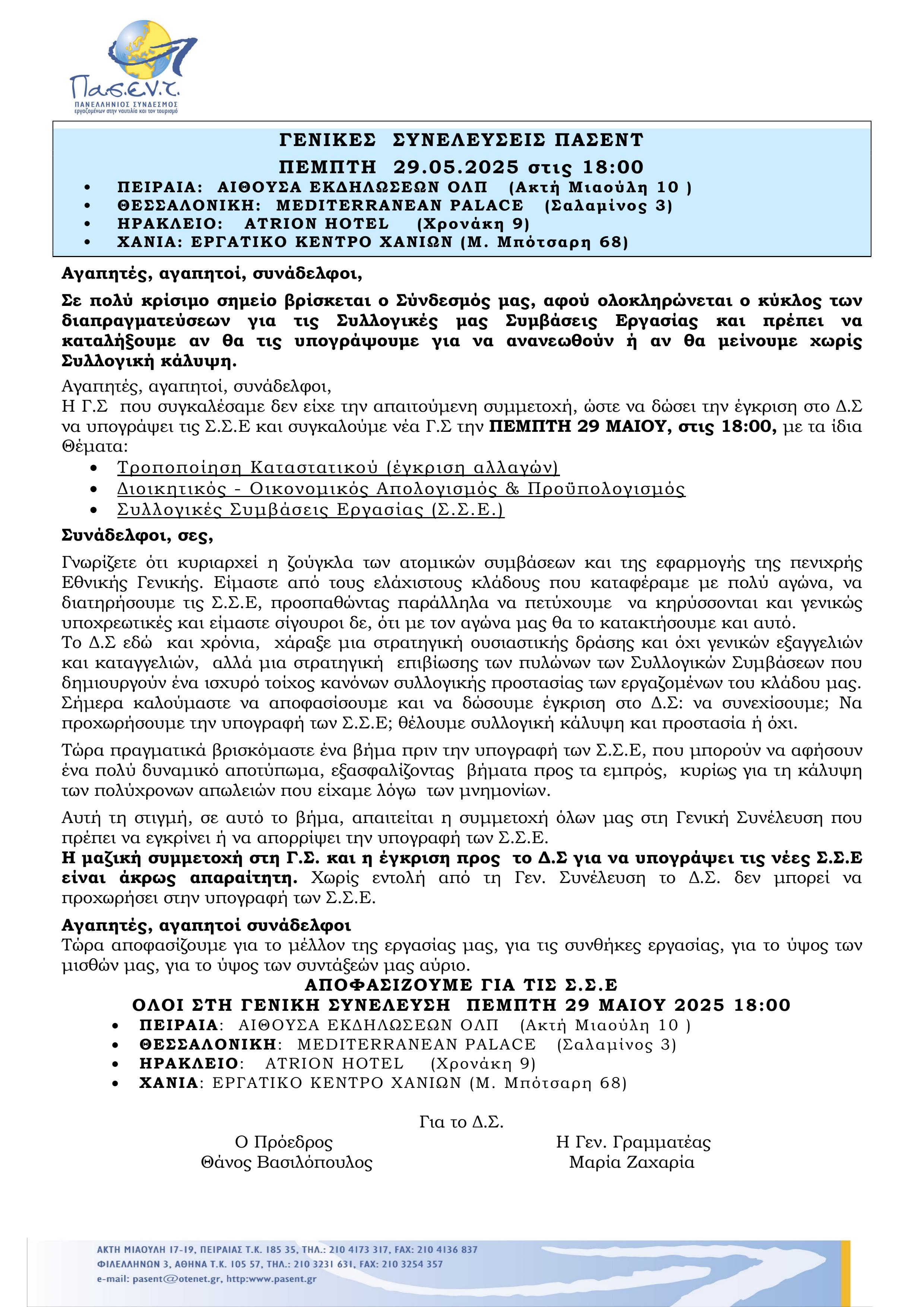 22/05/2025 ΓΕΝΙΚΗ ΣΥΝΕΛΕΥΣΗ ΠΑ.Σ.Ε.Ν.Τ. 29-5-2025